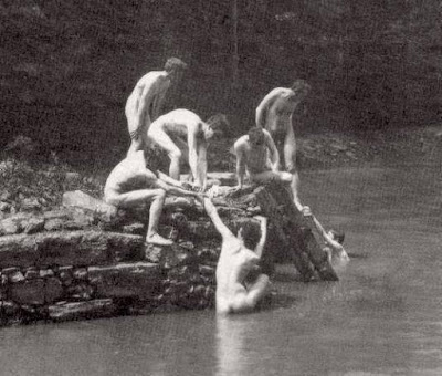 Pour sa célèbre toile The Swimming Hole (1885), Thomas Eakins s'inspira des photographies sur plaques de verre qu'il fit de ses jeunes modèles s'ébattant, nus, dans un accueillant trou d'eau (comme dirait Justin) :